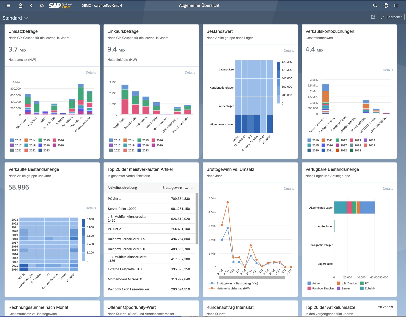 SAP Business One Web Analytics ist ein leistungsstarkes Tool welches im SAP Business One Webclient integriert ist und Ihnen dabei hilft, wichtige Erkenntnisse aus Ihren Unternehmensdaten zu gewinnen. Es ermöglicht Ihnen, Daten aus verschiedenen Quellen zu sammeln, zu analysieren und in aussagekräftige Berichte und Dashboards umzuwandeln. Dadurch erhalten Sie einen klaren Überblick über die Leistung und Trends Ihres Unternehmens.
