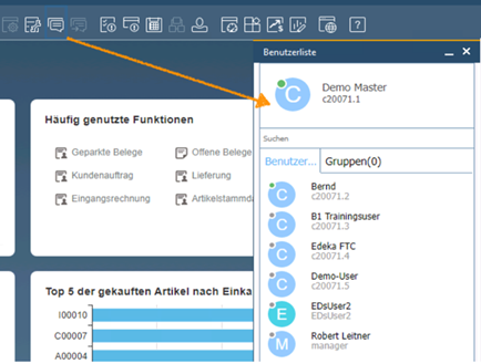 Sofern die Live-Zusammenarbeit in den Grundeinstellung Ihres SAP Business One aktiviert ist, können Sie nach dem Klick auf das Sprechblasen-Icon () in dem sich öffnenden Dialogfenster sehen, welche Systemanwendenden ebenfalls online, also in SAP Business One angemeldet, sind (online = grüner Punkt, offline = grauer Punkt).