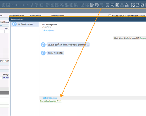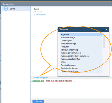 Nach einem Doppelklick auf den User-Namen öffnet sich ein Chatfenster, in dem Sie mit der jeweiligen Person direkt schreiben können. Der wirklich Clou versteckt sich meiner Meinung nach aber in dem Hyperlink „Daten freigeben“ (blaue Schrift, siehe Screenshot). Hier können im Chat jegliche Belege bzw. Datensätze verknüpft werden, so dass der/die Empfänger:in nur darauf zu klicken braucht, um den Beleg in einem separaten Fenster zu öffnen.