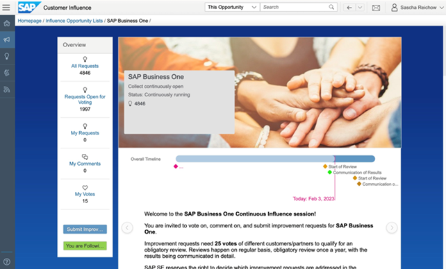 Zusätzlich hat SAP das „Customer Influence Program“ ins Leben gerufen, um die Vorteile der Open und Closed Source Software miteinander zu kombinieren. Zum einen bleibt die zentrale Softwareentwicklung (und damit auch die Produkthaftung) bei der SAP SE verortet, anderseits werden Kund:innen und Anwendende selbst als Community verstanden und können über das „Customer Influencer Portal“ gewünschte Funktionen und Weiterentwicklungen direkt bei SAP einreichen und ihre Vorschläge von anderen Anwendenden bewerten und gewichten lassen. In regelmäßigen Abständen werden die eingebrachten Vorschläge durch das SAP Entwicklerteam evaluiert und im Falle von „most wanted“-Wünschen in folgenden Software-Updates integriert.